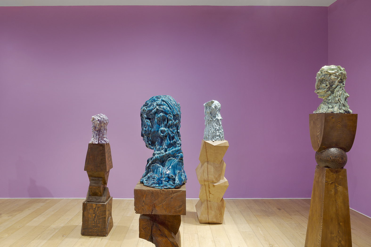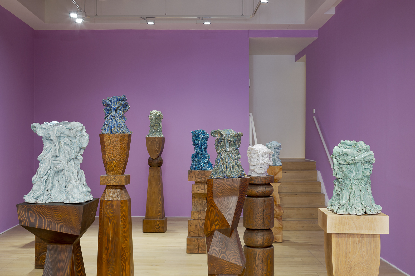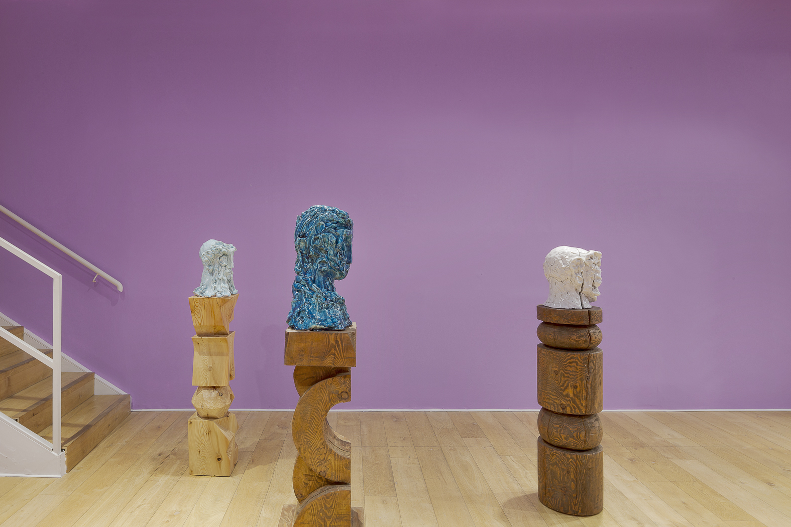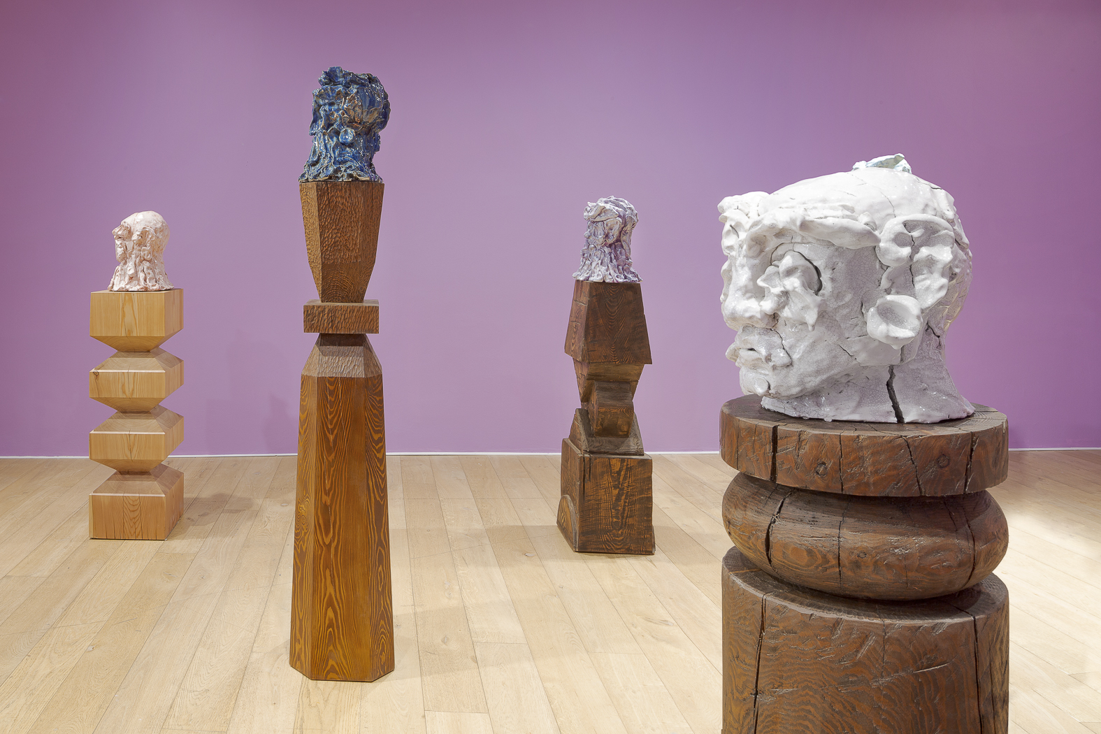 Each sculpture in the Fragile Heads Series features a colour-glazed porcelain bust, poised on a custom- carved wooden base. While Gray has long been celebrated for his mastery of marble, this new series welcomes the unpredictability of porcelain. By working with a medium that through its creation is prone to cracking and warping, Gray challenges traditional sculptural conventions, using its rawness, imperfections, and inherent fragility as expressive tools to resonate upon how tensions between resilience and vulnerability are intrinsic to the shaping of one’s identity.