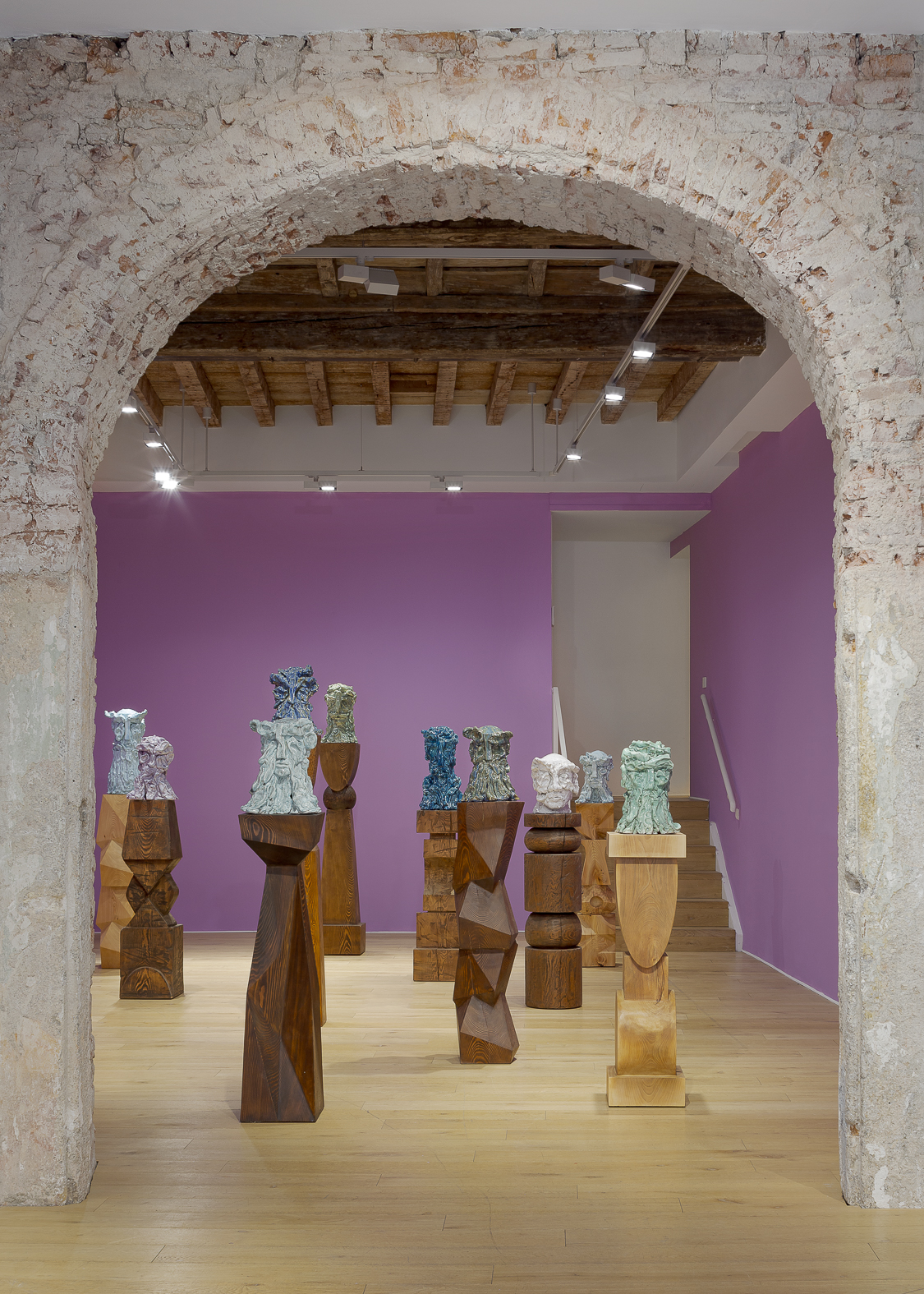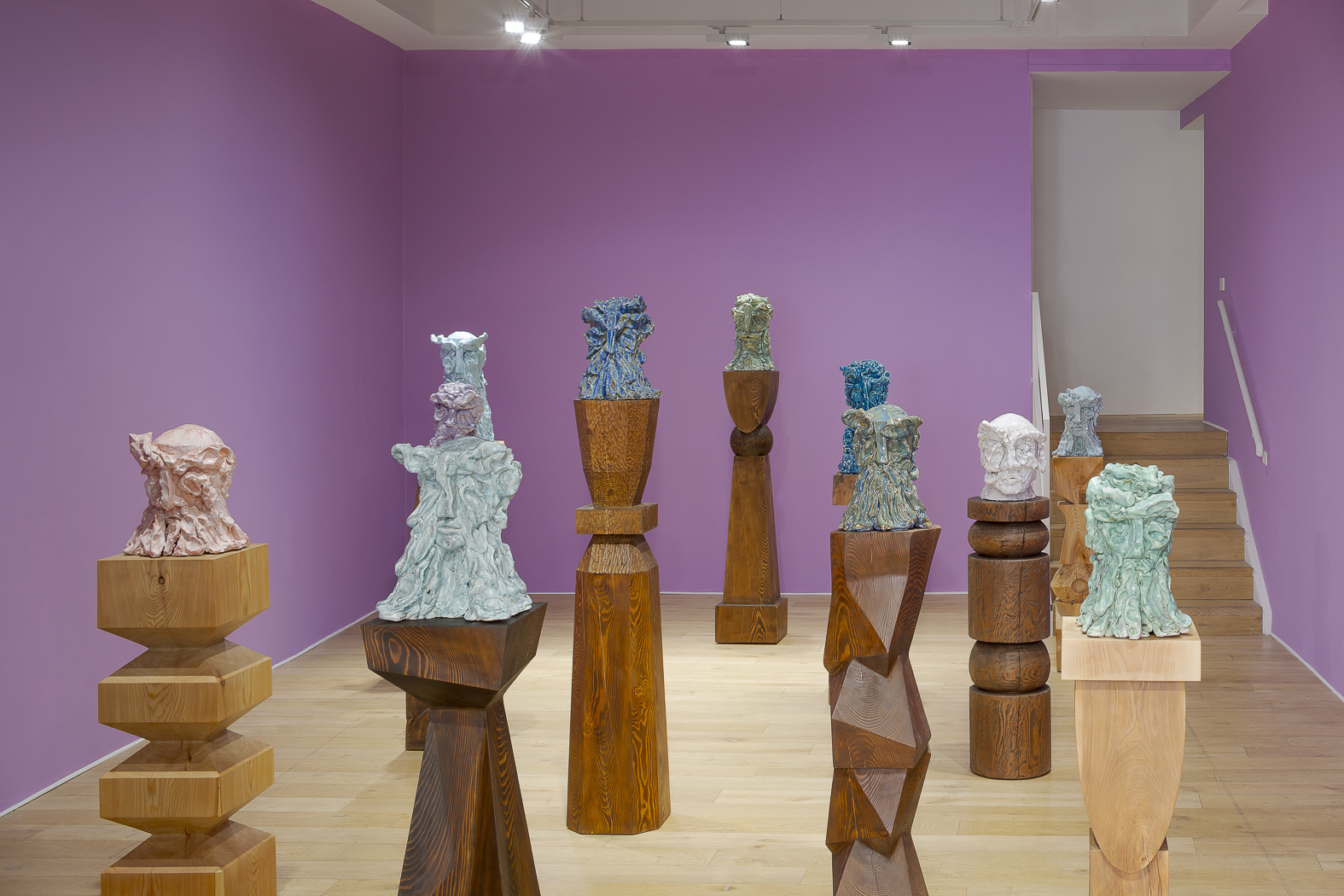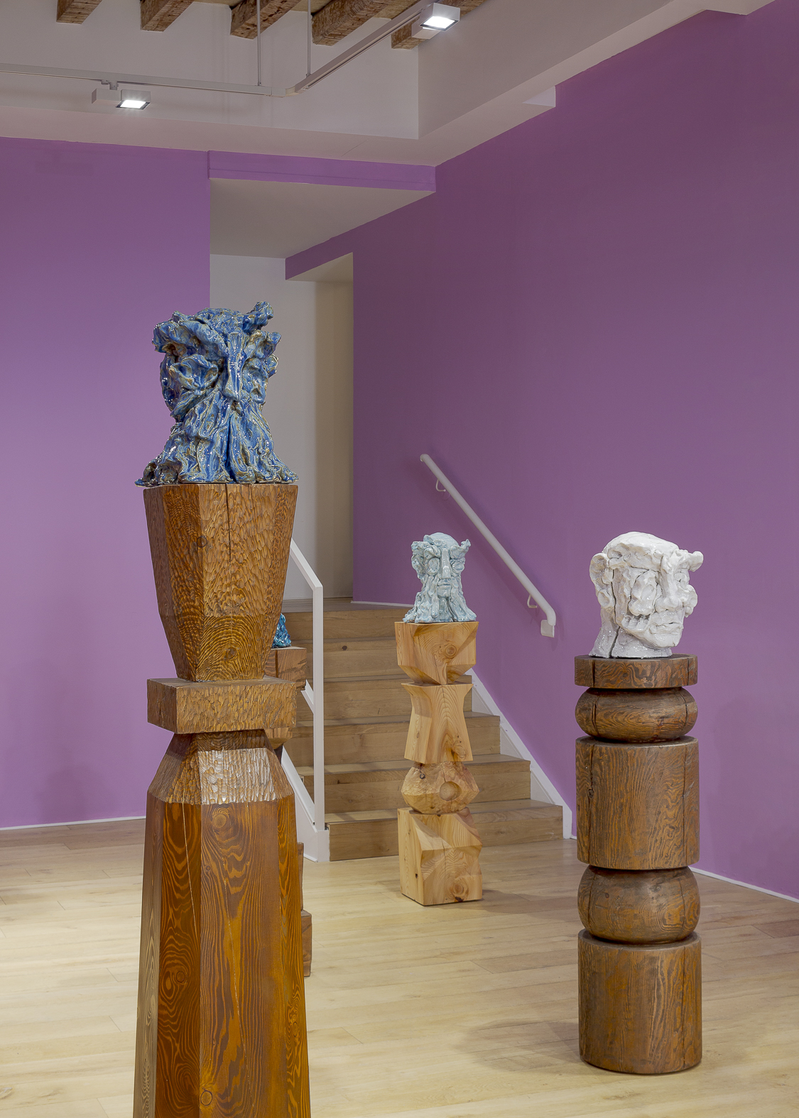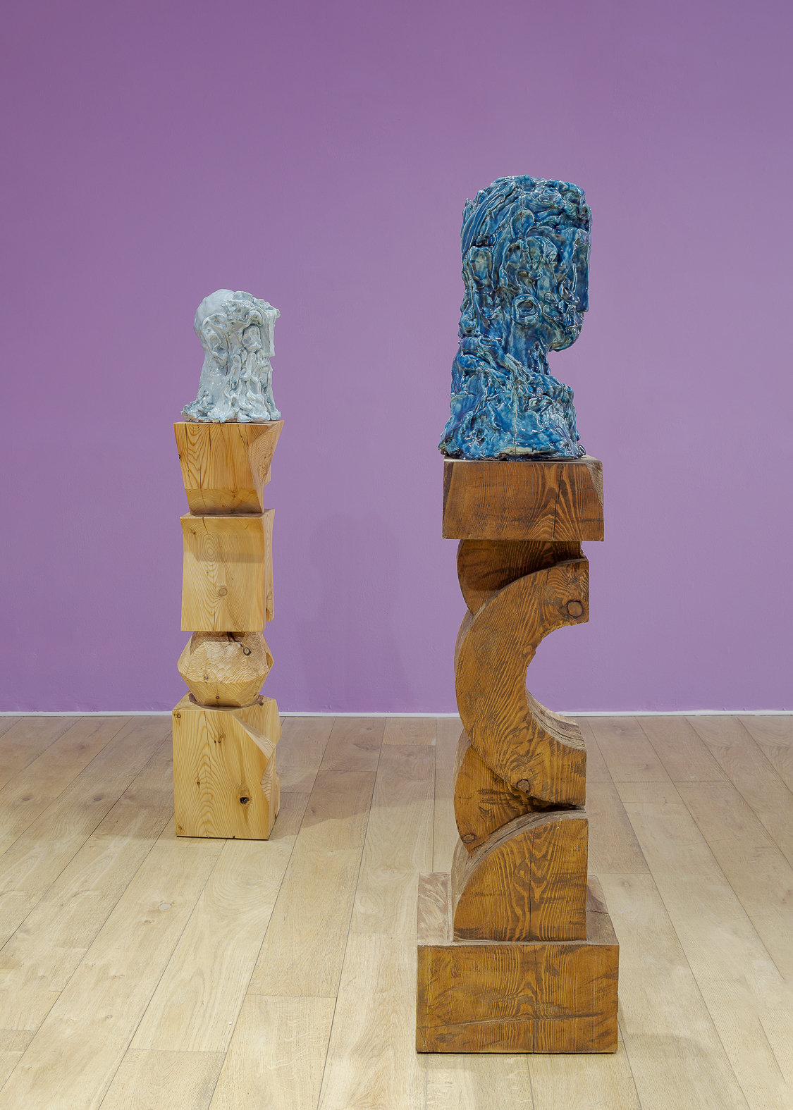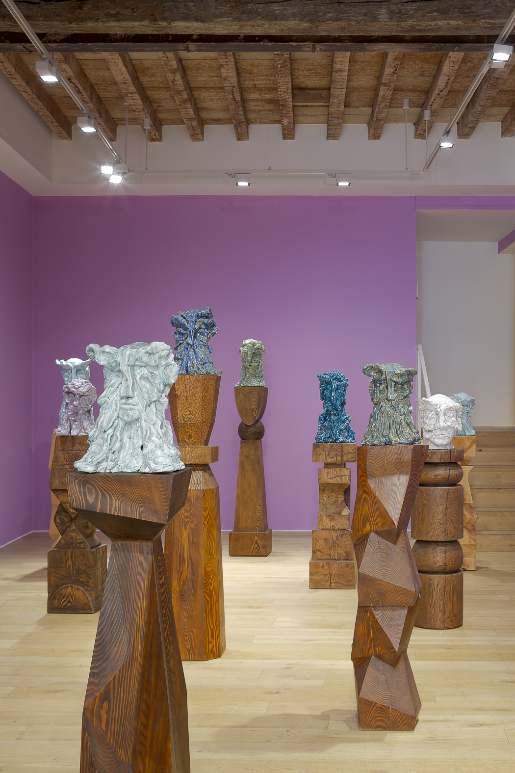 Each sculpture in the Fragile Heads Series features a colour-glazed porcelain bust, poised on a custom- carved wooden base. While Gray has long been celebrated for his mastery of marble, this new series welcomes the unpredictability of porcelain. By working with a medium that through its creation is prone to cracking and warping, Gray challenges traditional sculptural conventions, using its rawness, imperfections, and inherent fragility as expressive tools to resonate upon how tensions between resilience and vulnerability are intrinsic to the shaping of one’s identity.