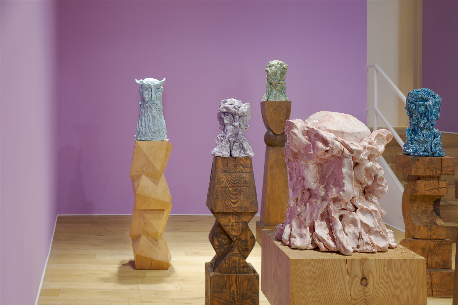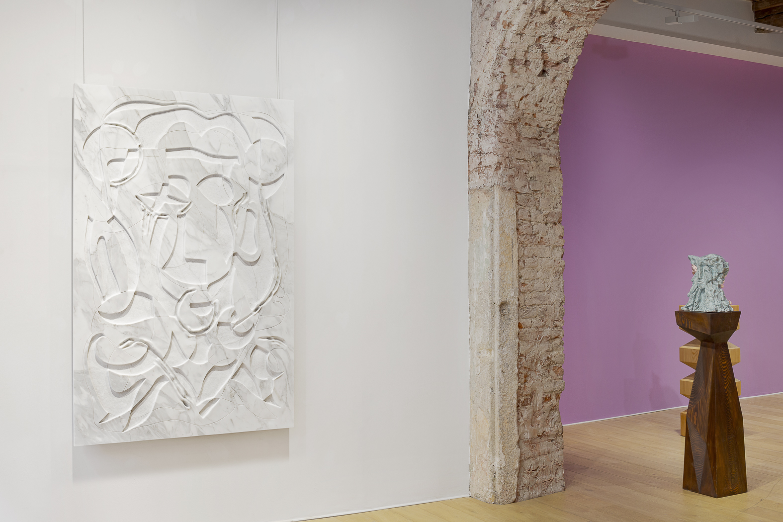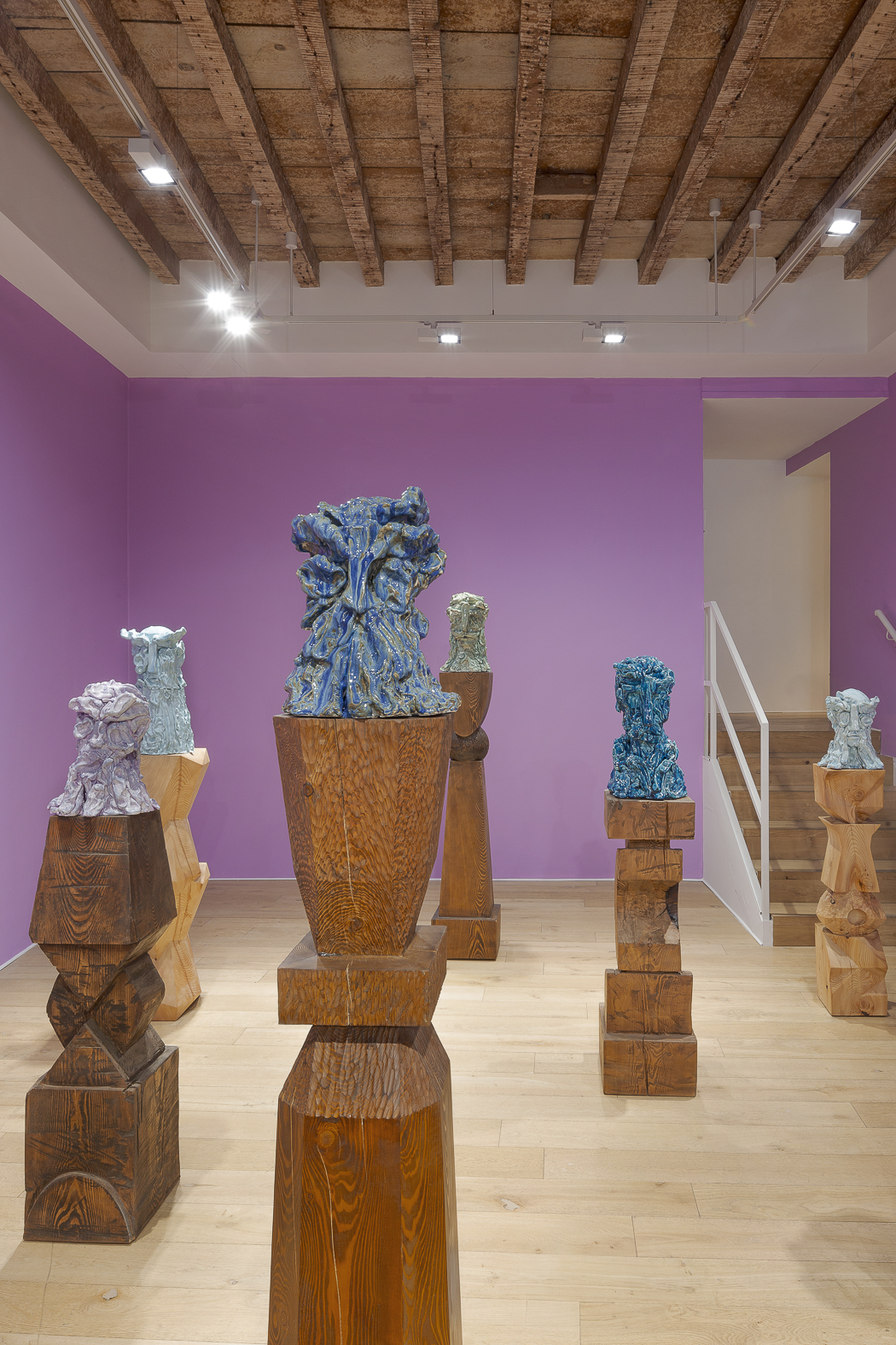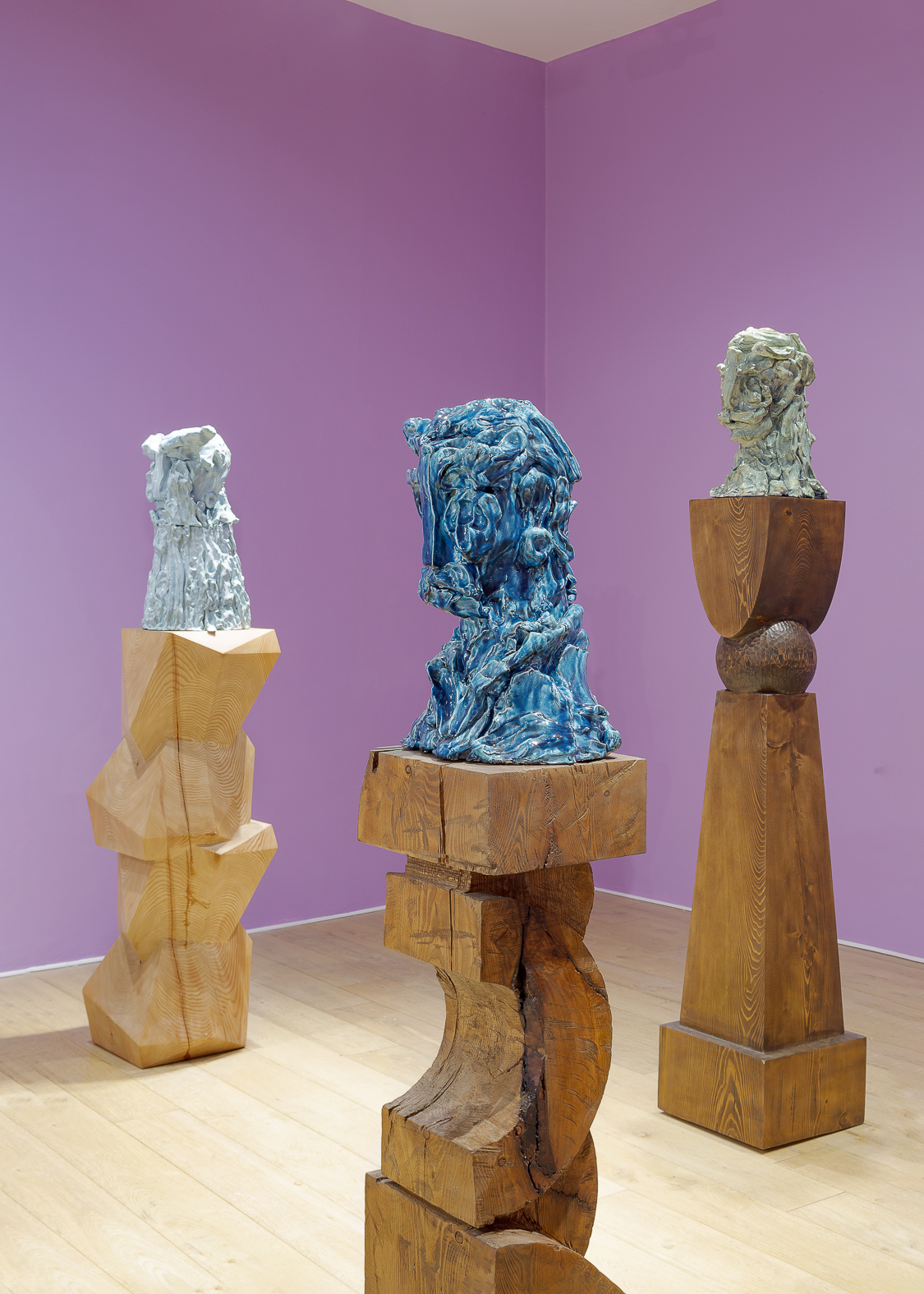 Each sculpture in the Fragile Heads Series features a colour-glazed porcelain bust, poised on a custom- carved wooden base. While Gray has long been celebrated for his mastery of marble, this new series welcomes the unpredictability of porcelain. By working with a medium that through its creation is prone to cracking and warping, Gray challenges traditional sculptural conventions, using its rawness, imperfections, and inherent fragility as expressive tools to resonate upon how tensions between resilience and vulnerability are intrinsic to the shaping of one’s identity.